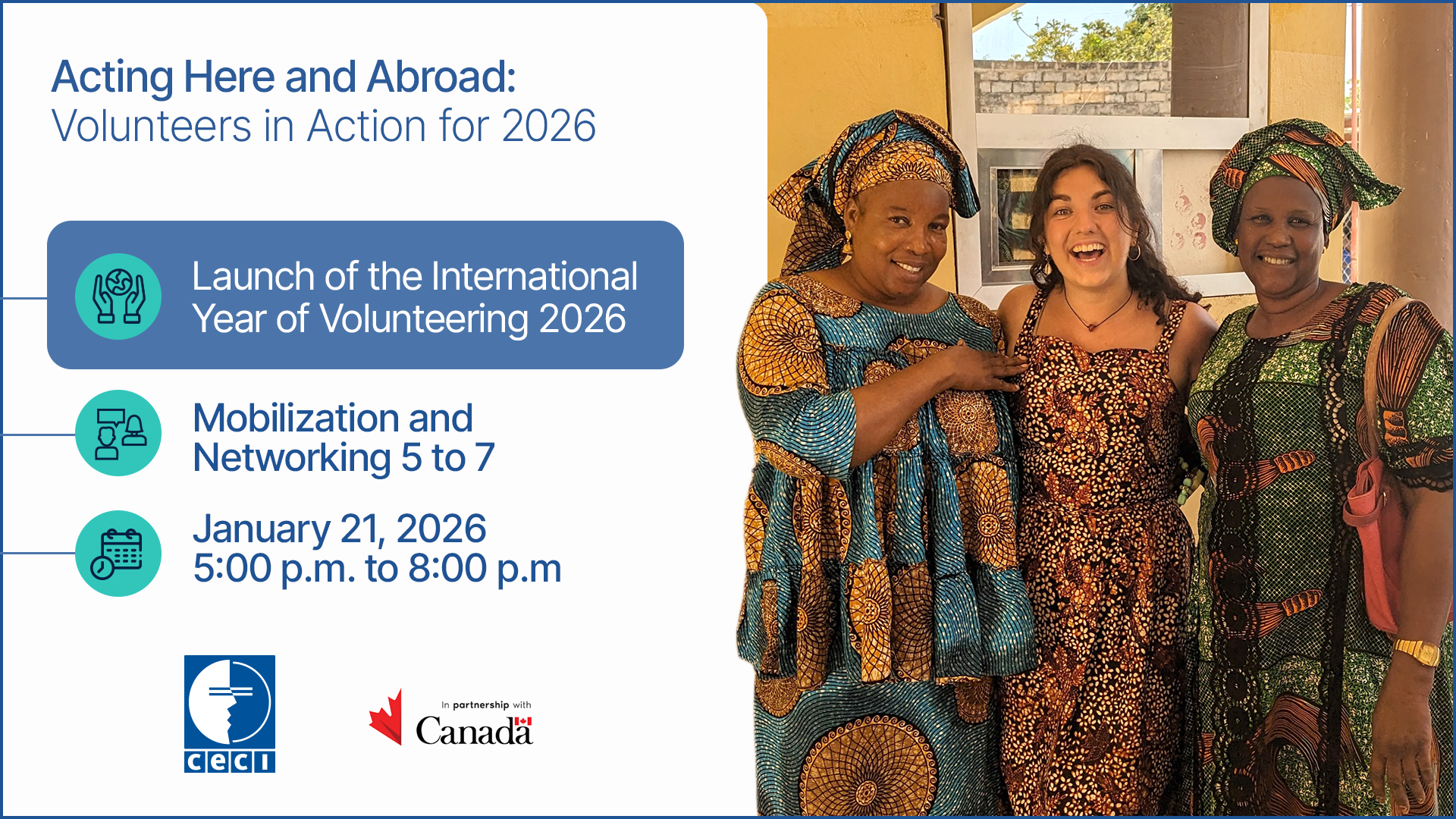 As part of the launch of the International Year of Volunteering 2026, CECI is hosting a festive and participatory 5 à 7 designed to bring together volunteers, partners, and individuals interested in volunteering, in order to celebrate civic engagement and kick off a year focused on collective action.