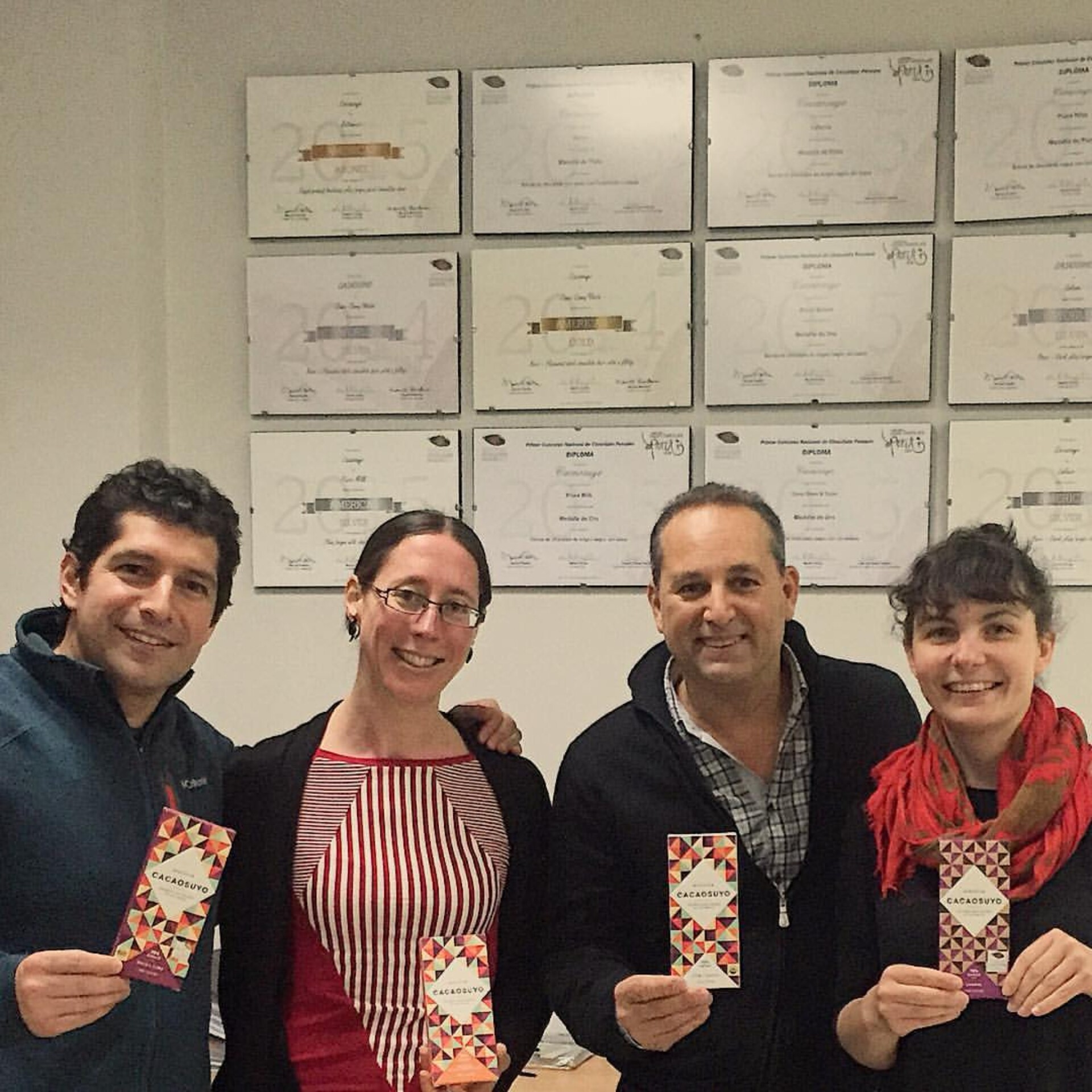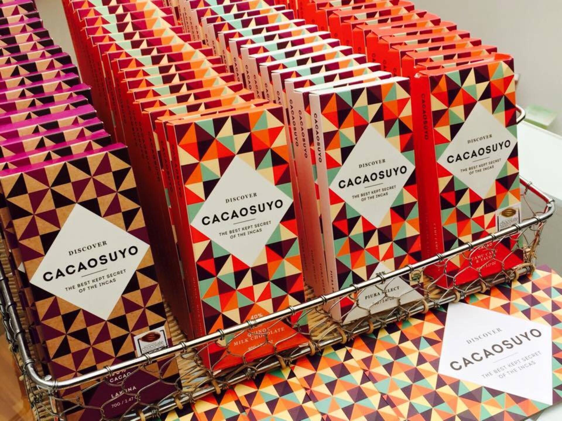 Samir and Eduardo were both working in fields completely unrelated to chocolate before starting their chocolate company. Samir was at one time a pop singer, the owner of a record company. He even was a textile exporter, taking the influence for the colourful geometric patterns of Cacaosuyo’s packaging from traditional Peruvian fabrics.