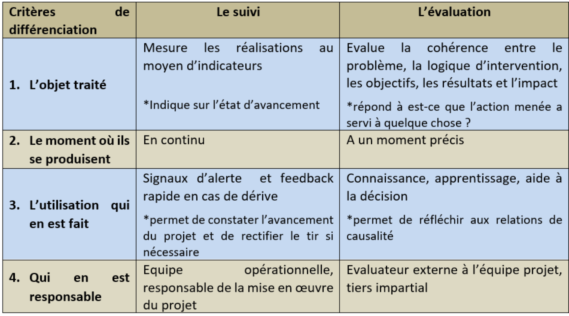 Le suivi-évaluation est un processus itératif de compte rendu clair et précis sur les résultats d’une intervention (3). Cependant, le suivi diffère de l’évaluation. Voici quatre critères de différenciation entre le suivi et l’évaluation (4).
