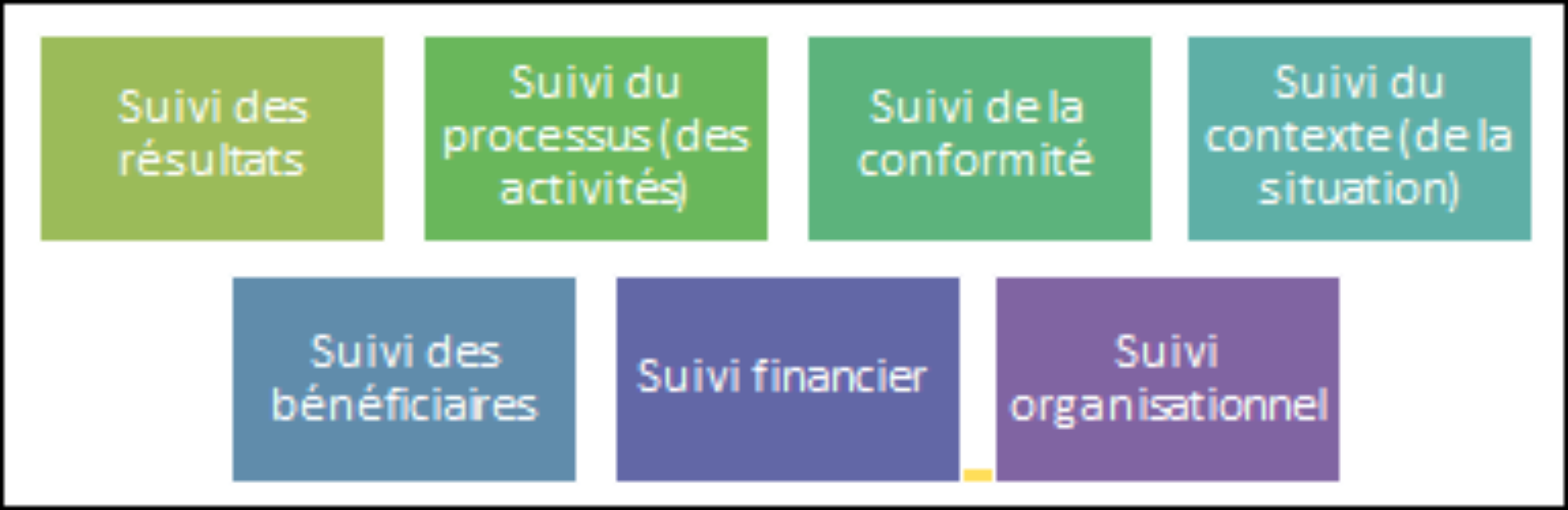 Le suivi est un processus continu de collecte et d’analyse systématique de données, selon indicateurs choisis, pour suivre les progrès réalisés par rapport aux plans établis, et vérifier leur conformité avec les normes établies (5,6). Il permet d’identifier les tendances et les schémas qui se dessinent, d’adapter les stratégies et de guider la prise de décisions relatives à la gestion du projet/programme (5).