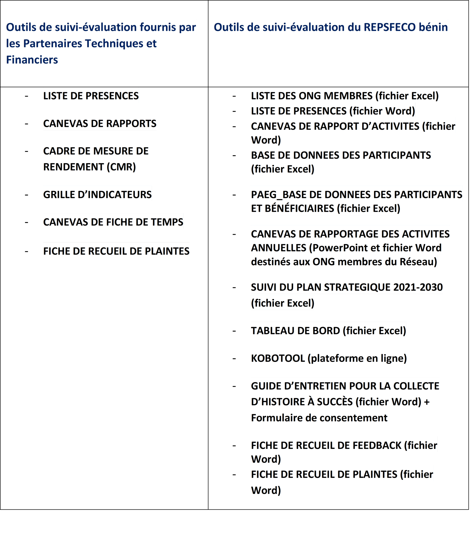 Le système de suivi-évaluation du REPSFECO Bénin compte plusieurs outils classés en deux catégories