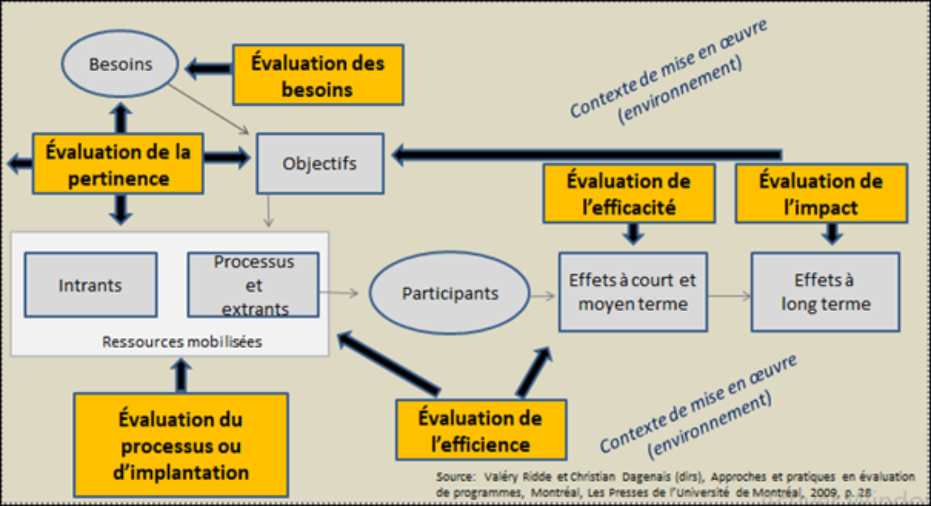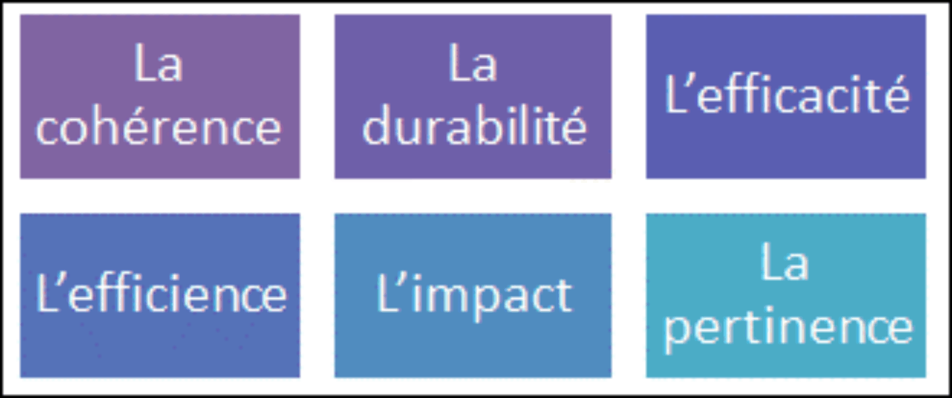 L’évaluation quant à elle, est une appréciation systématique et objective d’un projet, d’un programme ou d’une politique, en cours ou terminé, de sa conception, de sa mise en œuvre et de ses résultats. (7). De plus en plus utilisés dans les évaluations de projets en développement durable, voici les six (6) critères d’évaluation proposés par le Comité d’aide au développement (CAD) de l’Organisation de Coopération et de développement économique (OCDE) (7,8).