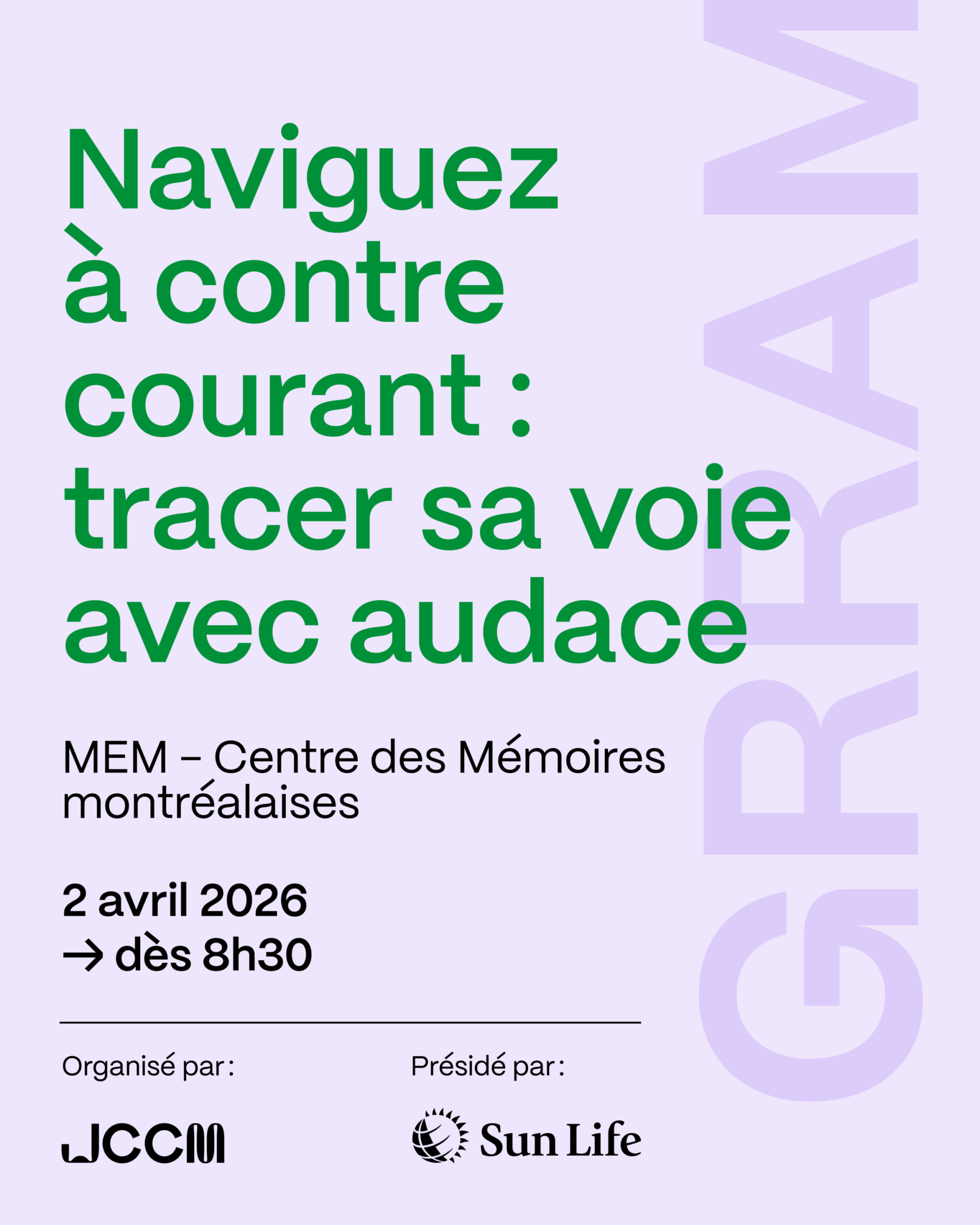 Le 2 avril 2026, au MEM – Centre des mémoires montréalaises, cette journée réunira des entrepreneur-e-s, dirigeant-e-s et acteur-trice-s de changement afin de réfléchir aux défis et aux opportunités liés à l’entrepreneuriat durable. Au programme : panels, conférences et activités de réseautage qui permettront de croiser les perspectives et d’explorer des trajectoires inspirantes.