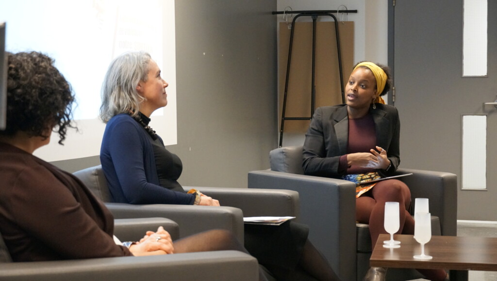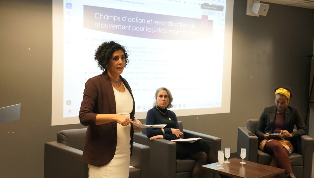 Nesrine Boussaih, professeure au Département de sexologie de l’UQAM et membre du RéQEF, a abordé la justice reproductive à partir d’une analyse des oppressions croisées vécues par les femmes dans l’accès aux services de santé. Elle a rappelé qu’il est impératif de :